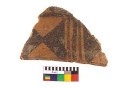 | Description / विवरण | A fragment of a potsherd. It is reddish in colour with black decorative geometric painting on it. |