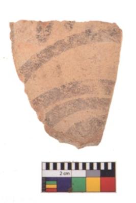 | Description / विवरण | A specimen of a potsherd. It is reddish in colour with black decorative geometric painting on it. |