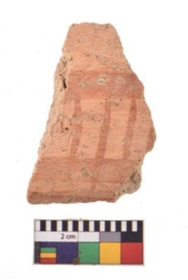 | Description / विवरण | A specimen of a potsherd. It is reddish in colour with black decorative geometric painting on it. |