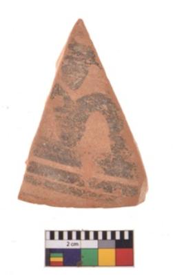 | Description / विवरण | A specimen of a potsherd. It is reddish in colour with black decorative geometric painting on it. |
