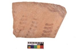 | Description / विवरण | Specimen of potsherd with decorative geometric painting. Type Black on Red Ware . |