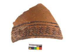| Description / विवरण | A fragment of a potsherd. It is reddish in colour with black decorative geometric painting on it. |