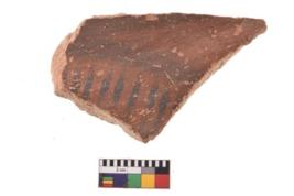 | Description / विवरण | A specimen of a potsherd. It is reddish in colour with black decorative geometric painting on it. |