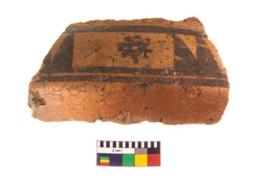| Description / विवरण | A fragment of a potsherd. It is reddish in colour with engraved decorative geometric painting on it. |