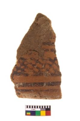 | Description / विवरण | A fragment of a potsherd. It is reddish in colour with black decorative geometric painting on it. |