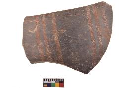 | Description / विवरण | Specimen of black on red ware with decorative geometric A row of latticed diamonds set in horizontal bands but having groups of oblique lines at intervals painting. |
