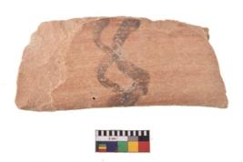| Description / विवरण | A specimen of a potsherd. It is reddish in colour with black decorative geometric painting on it. |