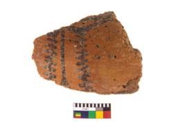 | Description / विवरण | A fragment of a potsherd. It is reddish in colour with black decorative geometric painting on it. |