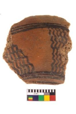 | Description / विवरण | A fragment of a potsherd. It is reddish in colour with black decorative geometric painting on it. |