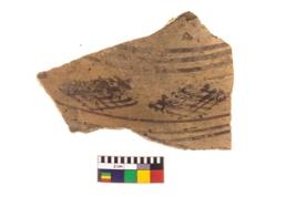 | Description / विवरण | A fragment of a potsherd. It is reddish in colour with black decorative geometric painting on it. |