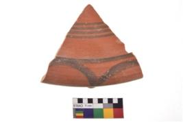 | Description / विवरण | A specimen of a potsherd. It is reddish in colour with black decorative geometric painting on it. |