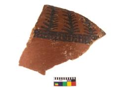 | Description / विवरण | A fragment of a potsherd. It is reddish in colour with black decorative geometric painting on it. |