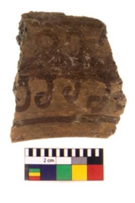 | Description / विवरण | A fragment of a potsherd. It is reddish in colour with black decorative geometric painting on it. |