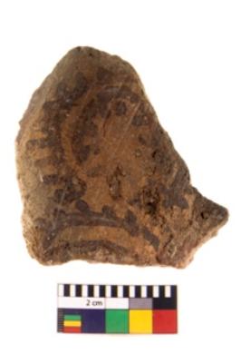 | Description / विवरण | A fragment of a potsherd. It is reddish in colour with black decorative geometric painting on it. |