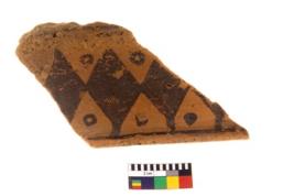| Description / विवरण | A fragment of a potsherd. It is reddish in colour with black decorative geometric painting on it. |