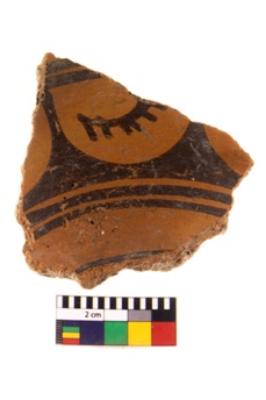 | Description / विवरण | A fragment of a potsherd. It is reddish in colour with black decorative geometric painting on it. |