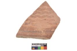 | Description / विवरण | A specimen of a potsherd. It is reddish in colour with black decorative geometric painting on it. |