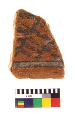 | Description / विवरण | A fragment of a potsherd. It is reddish in colour with black decorative geometric painting on it. |