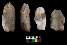 | Description / विवरण | There are n-4 of utilized cores. Out of them 1 is made up of Chalcedony and 3 are made up of Chert. There are multidirectional irregular dominant scar pattern on both dorsal and ventral face of the cores. |