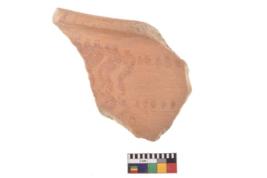 | Description / विवरण | A specimen of a potsherd. It is reddish in colour with black decorative geometric painting on it. |