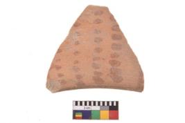 | Description / विवरण | A specimen of a potsherd. It is reddish in colour with black decorative geometric painting on it. |