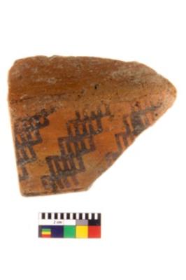 | Description / विवरण | A fragment of a potsherd. It is reddish in colour with black decorative geometric painting on it. |