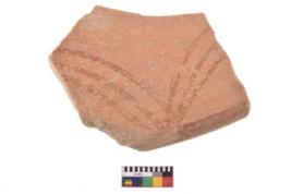 | Description / विवरण | A specimen of a potsherd. It is reddish in colour with black decorative geometric painting on it. |