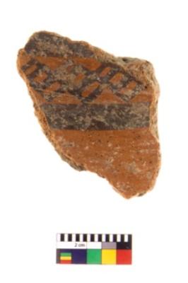 | Description / विवरण | A fragment of a potsherd. It is reddish in colour with black decorative geometric painting on it. |