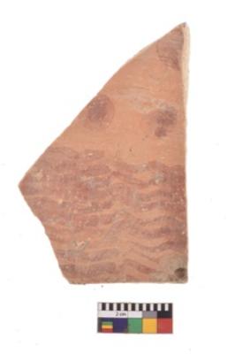 | Description / विवरण | A specimen of a potsherd. It is reddish in colour with black decorative geometric painting on it. |