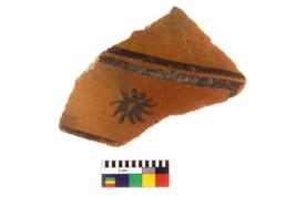| Description / विवरण | A fragment of a potsherd. It is reddish in colour with black decorative nature painting on it. |