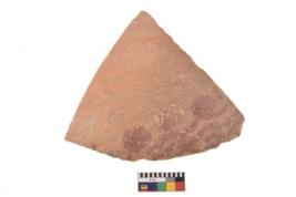 | Description / विवरण | A specimen of a potsherd. It is reddish in colour with black decorative geometric painting on it. |