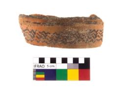| Description / विवरण | A fragment of a potsherd. It is reddish in colour with engraved decorative geometric painting on it. |