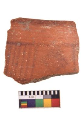 | Description / विवरण | Specimen of potsherd with decorative geometric painting. Type Black on Red Ware . |