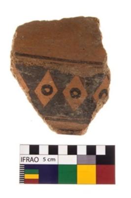 | Description / विवरण | A fragment of a potsherd. It is reddish in colour with black decorative geometric painting on it. |