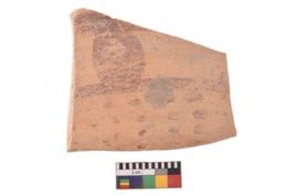 | Description / विवरण | A specimen of a potsherd. It is reddish in colour with black decorative geometric painting on it. |