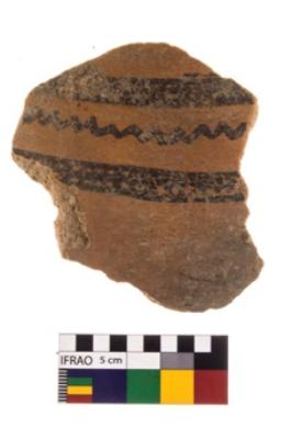 | Description / विवरण | A fragment of a potsherd. It is reddish in colour with black decorative geometric painting on it. |
