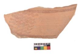 | Description / विवरण | A specimen of a potsherd. It is reddish in colour with black decorative geometric painting on it. |