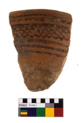 | Description / विवरण | A fragment of a potsherd. It is reddish in colour with black decorative geometric painting on it. |