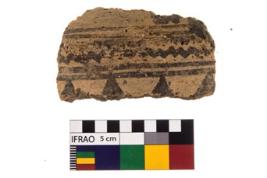 | Description / विवरण | A fragment of a potsherd. It is reddish in colour with black decorative geometric painting on it. |