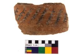 | Description / विवरण | A fragment of a potsherd. It is reddish in colour with black decorative geometric painting on it. |