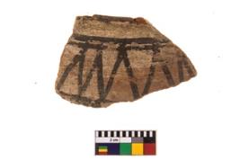 | Description / विवरण | A fragment of a potsherd. It is reddish in colour with black decorative geometric painting on it. |