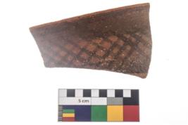 | Description / विवरण | Specimen of potsherd with black decorative geometric Net Pattern painting . |