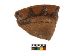 | Description / विवरण | A fragment of a potsherd. It is reddish in colour with black decorative geometric painting on it. |