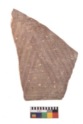 | Description / विवरण | A specimen of a potsherd. It is reddish in colour with black decorative geometric painting on it. |