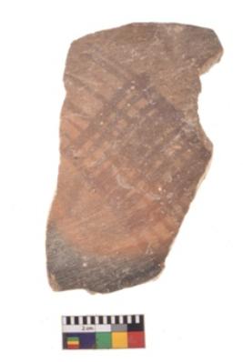 | Description / विवरण | A specimen of a potsherd. It is reddish in colour with black decorative geometric painting on it. |