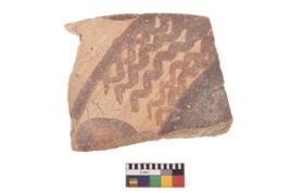 | Description / विवरण | A specimen of a potsherd. It is reddish in colour with black decorative geometric painting on it. |
