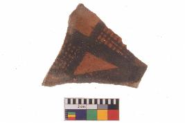 | Description / विवरण | Specimen of potsherd with black decorative geometric Diamond set broad horizontal bands painting, Type Black on Red Ware . |