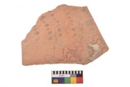 | Description / विवरण | A specimen of a potsherd. It is reddish in colour with black decorative geometric painting on it. |