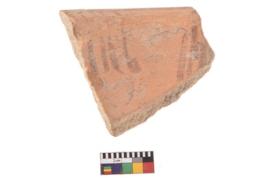 | Description / विवरण | A specimen of a potsherd. It is reddish in colour with black decorative geometric painting on it. |