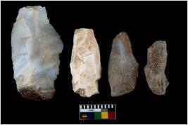 | Description / विवरण | There are n-4 of utilized cores. Out of them 2 are made up of Chalcedony and 2 are made up of Chert. There are multidirectional irregular dominant scar pattern on both dorsal and ventral face of the cores. |